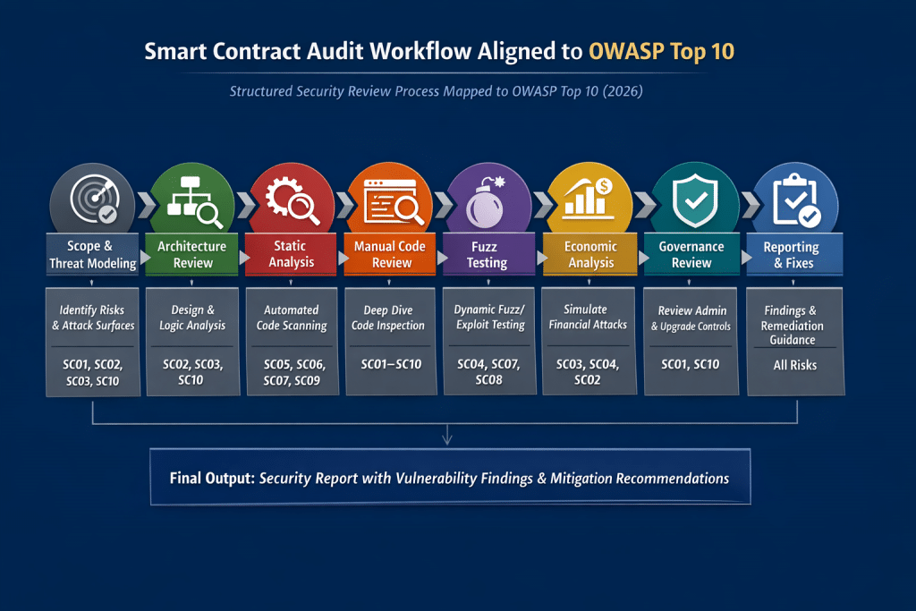 The OWASP Smart Contract Top 10 is an industry-standard awareness and guidance document for Web3 developers and security teams detailing the most critical classes of vulnerabilities in smart contracts. It’s based on real attacks and expert analysis and serves as both a checklist for secure design and an audit reference to help reduce risk before deployment.