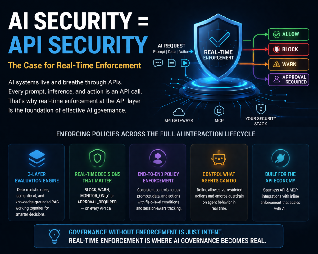 What separates mature AI security programs from the rest is the ability to enforce policies in real time, exactly where AI systems operate—at the API layer.