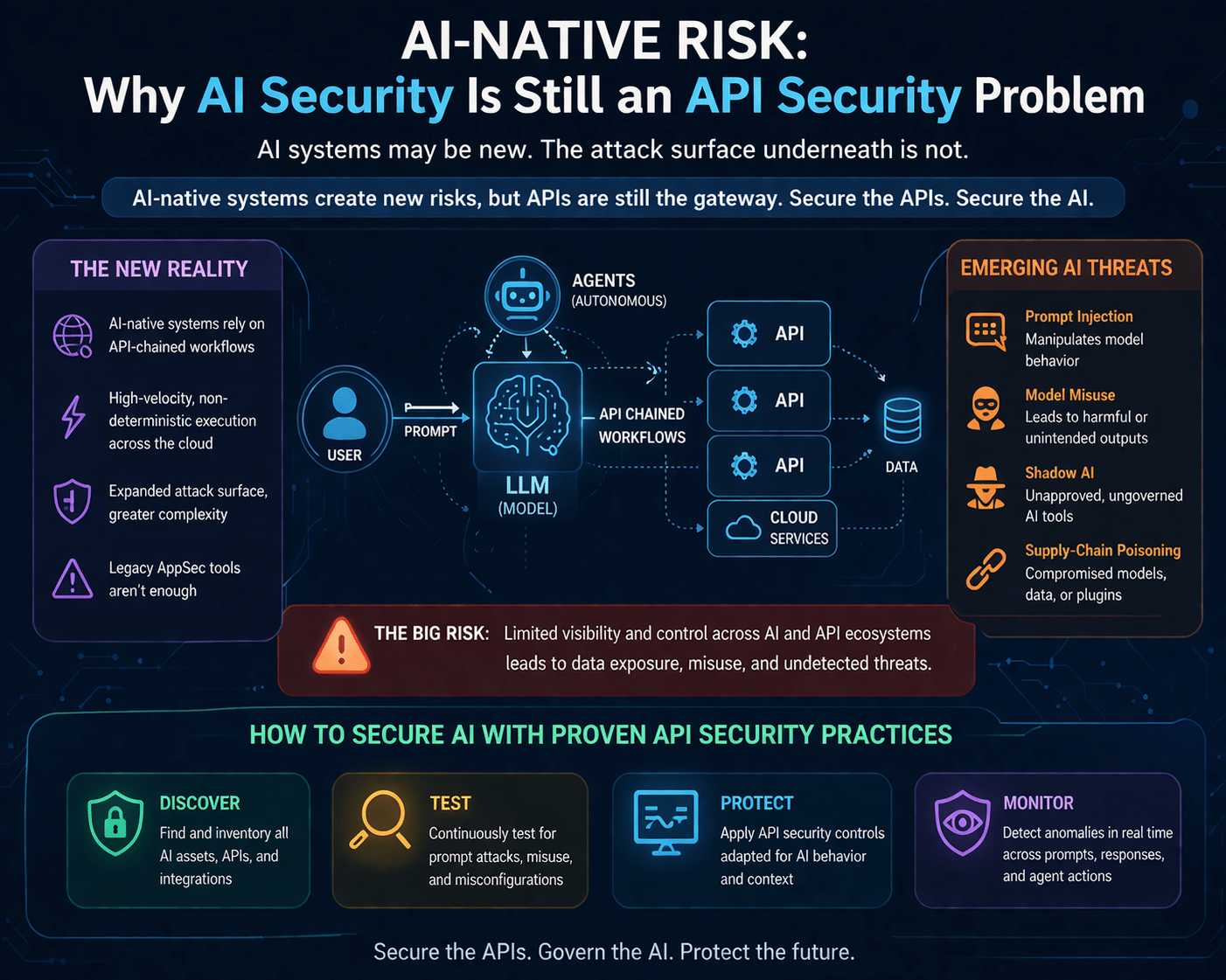 At its core, AI security remains an API security challenge. Modern AI systems—especially those powered by large language models (LLMs) and autonomous agents—operate through API-driven architectures. Every prompt, response, and action is mediated through APIs, making them the primary attack surface. The difference is that AI introduces non-deterministic behavior, increasing the difficulty of predicting and controlling how these APIs are used.