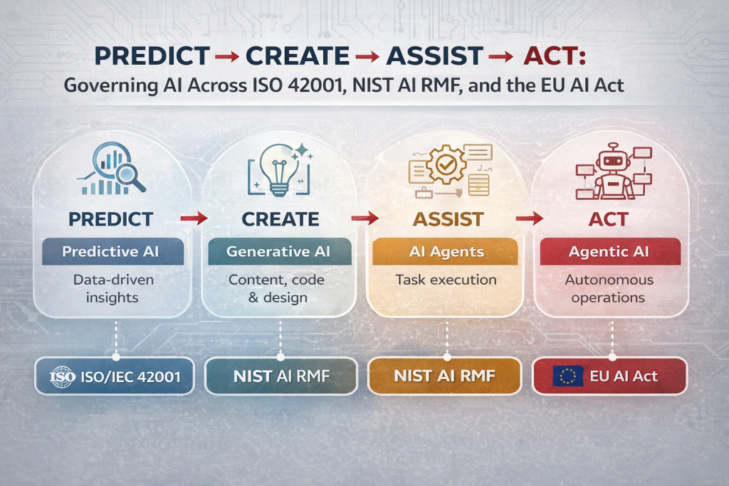 Below is a clean, standards-aligned mapping of the four AI types (Predict β Create β Assist β Act) to ISO/IEC 42001, NIST AI RMF, and the EU AI Act.