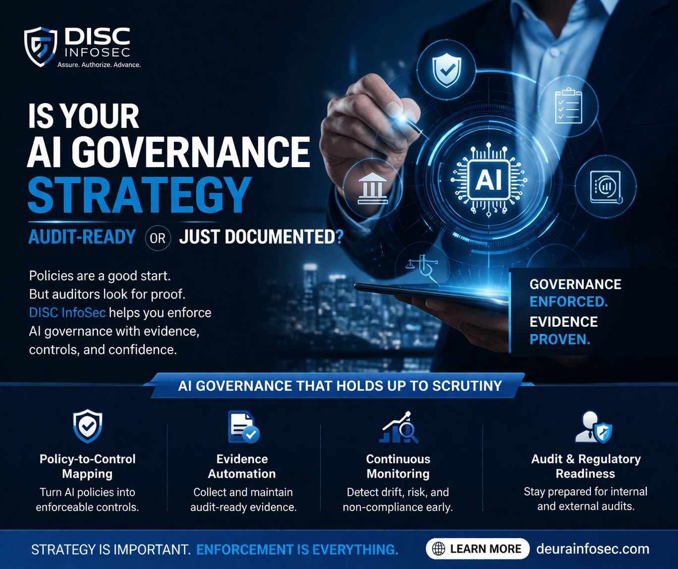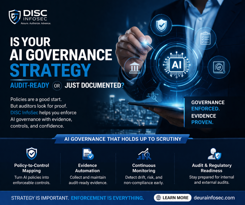 At DISC InfoSec, we help organizations navigate this landscape by aligning AI risk management, governance, security, and compliance into a single, practical roadmap. Whether you are experimenting with AI or deploying it at scale, we help you choose and operationalize the right frameworks to reduce risk and build trust. Learn more at DISC InfoSec.