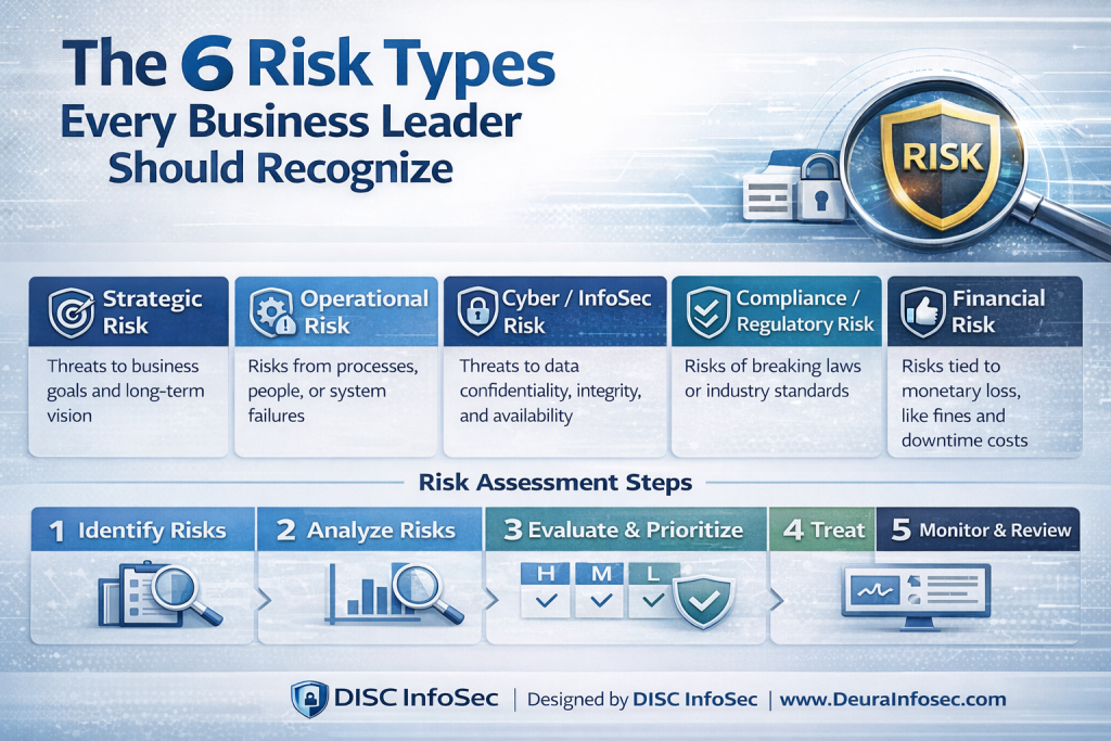 Organizations face multiple types of risks that can affect strategy, operations, compliance, and reputation. Strategic risks arise when business objectives or long-term goals are threatened—such as when weak security planning damages customer confidence. Operational risks stem from human errors, flawed processes, or technology failures, like a misconfigured firewall or inadequate incident response.