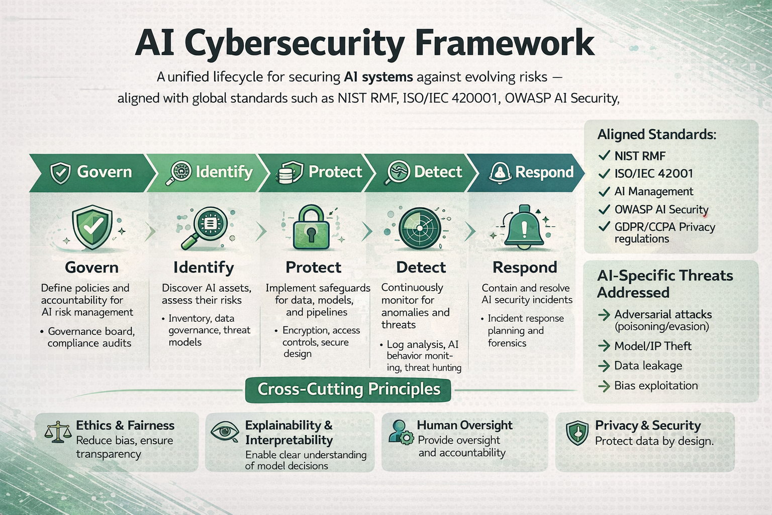 AI Cybersecurity framework provides a holistic approach to securing AI systems by integrating governance, risk management, and technical defense across the full AI lifecycle. It aligns with widely-accepted standards such as NIST RMF, ISO/IEC 42001, OWASP AI Security Top 10, and privacy regulations (e.g., GDPR, CCPA).