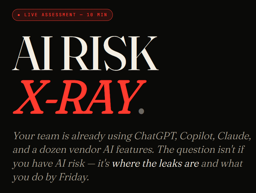 • You want a comprehensive enterprise AI risk assessment. This is a 10-minute snapshot, not a 6-week engagement. It surfaces the pain. It doesn’t replace deep work.